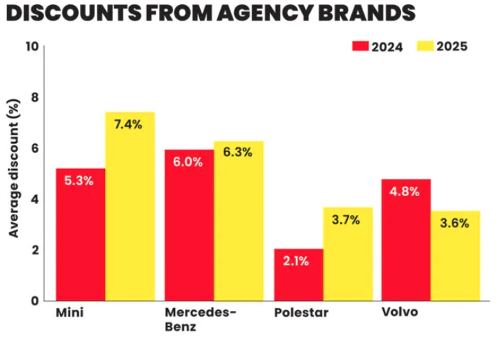 According to Autotrader, in August last year the value of these reductions offered by the agency brands Mini, Mercedes-Benz, Polestar and Volvo averaged 4.6%. Although much lower than the discounts offered by traditional dealers, in common with the rest of the motor trade, 12 months later they had risen, albeit only to 5.3%.