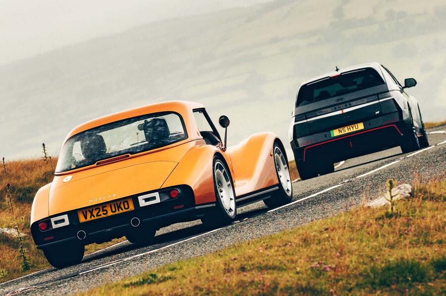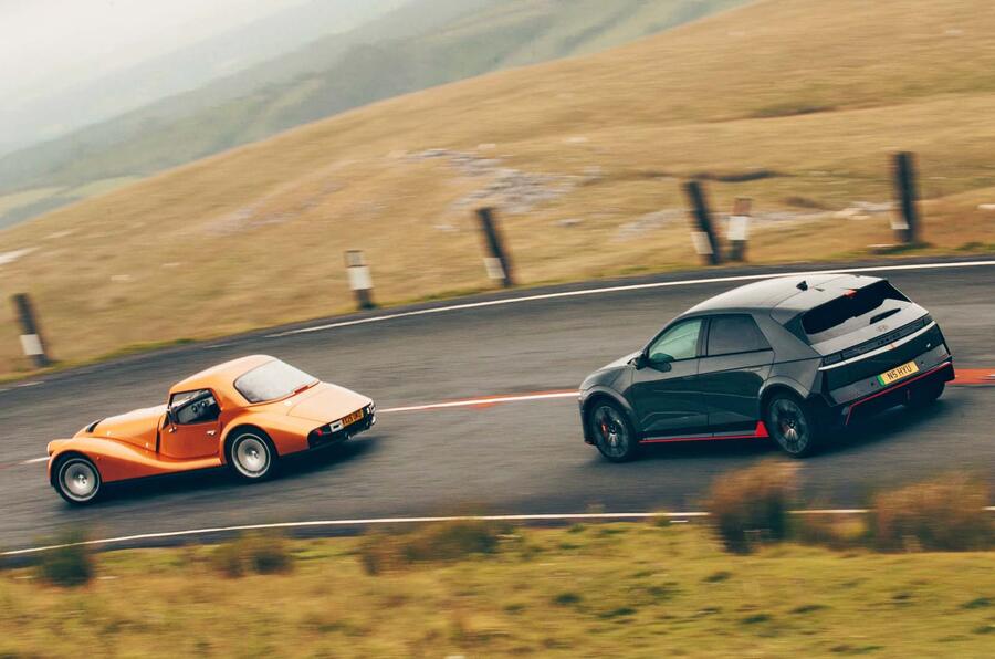 Yet, as I blatted my way through the Ioniq 5 N’s not-really-gears, the synthesised pop-pop-crackle of the not-really-overrun ringing through the cabin as I wound my way up to the car park to meet road tester Illya Verpraet with the Morgan, I got to thinking.